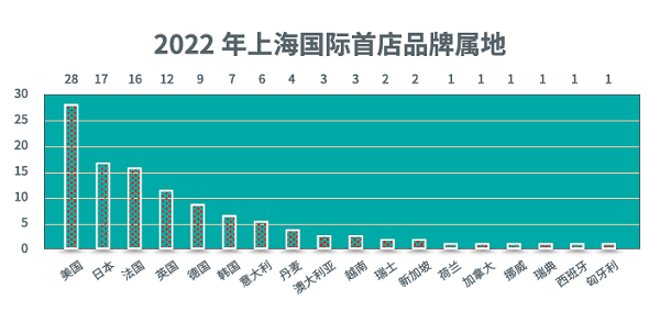 上海2022年引進的國際品牌首店,從來源看,引入美國首店品牌28家、日本品牌17家、法國品牌16家,還有英國、德國、韓國、意大利的。從業態分布來看,零售業態首店占據絕對優勢,共計91家,占比73.4%;餐飲業態首店共19家,占比15.3%;其余為生活服務及娛樂類。