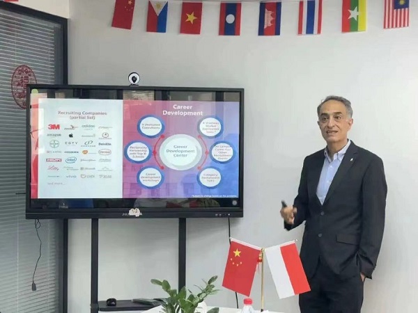 中歐國際工商學院中歐國際工商學院學術主任馬志德鼓勵留學生們,把握機遇,讓資源優勢、平臺效應最大化,實現中企和印尼留學生們的互相成就、互相發展。