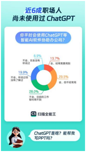 連續幾個月上“熱搜”的ChatGPT,有超六成受訪者稱,自己尚未用過這類軟件。掃描全能王的一位用戶表示,雖然ChatGPT之類軟件能夠很快捷地進行文字組織,但其反饋的內容,目前還比較偏模式化,在應對專業性較強的題材時,用途有限。