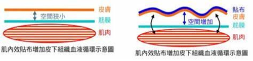 當肌內效貼布以正確的?式粘貼在?膚上時,就會根據肌貼的形狀和本身的張?對皮膚產?牽拉作?,使?膚與肌?之間的間隙增?,?當肌?組織受到損傷時,體內組織液和?細胞就會聚集,受傷部位的身體?下組織與肌?之間的間隙就會因擠壓?變窄。此時,可以利?肌貼加速?膚組織下?液的回流,提?身體的新陳代謝從?減少肌?疼痛,調節淋巴液所在的流動空間,保證身體循環處于正常運?狀態,從?縮短受傷部位的愈合時間。