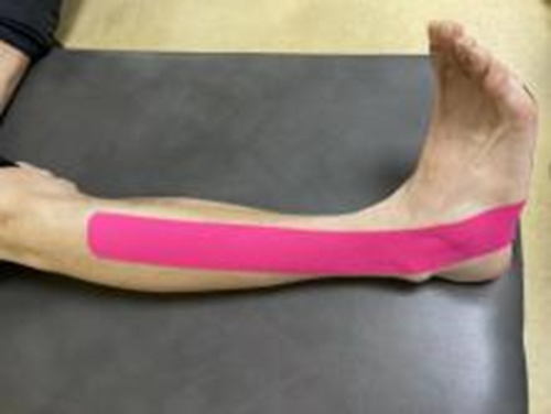 第?步肌?貼扎:腓??短肌促進貼法。踝關節背屈內翻。采用I形貼布,將錨固定于腓?外側?上1/3-2/3處,以?然拉?向第5跖?粗隆延展,尾端固定于?底。
