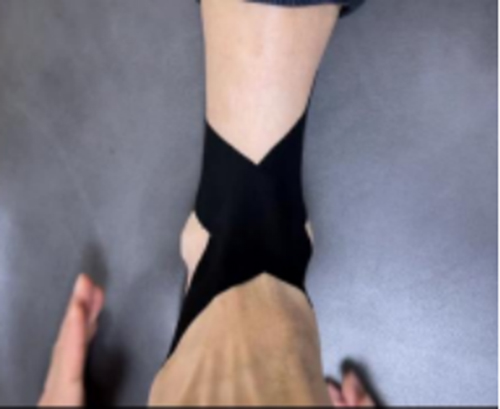 第五步穩定貼扎:采?I形貼布,踝關節中?位,中間為錨,施加50-70%拉?固定于距?正前?,尾端不施加拉?向兩側包繞距?固定。