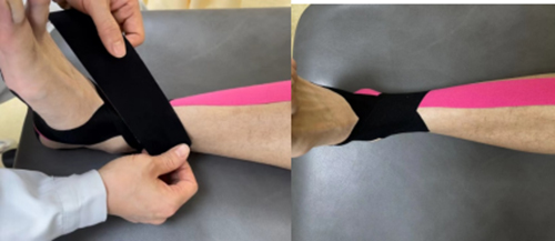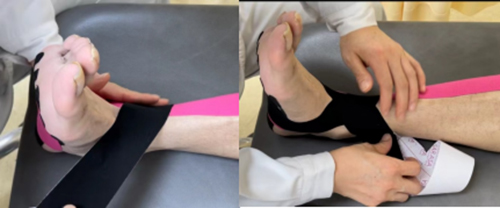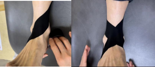 第四步穩定貼扎:采? I形貼布,踝關節中?位,中間為錨固定于跟?下?,兩端分別以?然拉?向內、外踝延展,尾端?拉?固定于內、外踝上?。