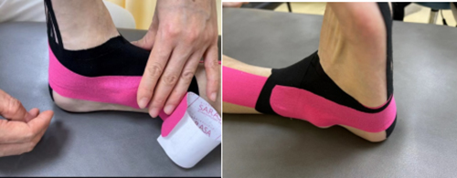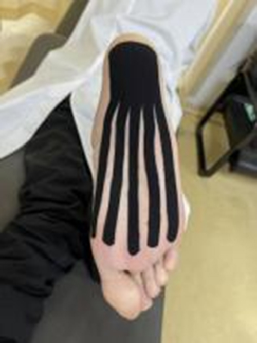 第?步感覺貼扎:踝關節背屈,五趾背屈。采??形貼布,將錨固定于跟?,以?然拉?(?拉?)沿?底向跖趾關節遠端延展,尾端?拉?固定于五趾跖?處。