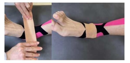 第三步韌帶貼扎:采?I形貼布2條,踝關節中?位。?條貼布的錨固定于內踝上?,起始段不施加拉?,斜向延展?外踝,在到達外踝前?時施加50-70%的拉?,經外踝外側副韌帶處后,不施加拉?經?底繞至內踝上?,尾端不施加拉?固定于內踝上?。形成?個8字。另?條貼布的錨固定于外踝上?,起始段不施加拉?,斜向延展至內踝,在到達內踝前?時施加50-70%的拉?,經內踝側副韌帶處后,不施加拉?經?底繞至外踝上?,尾端不施加拉?固定于外踝上?,形成?個8字。