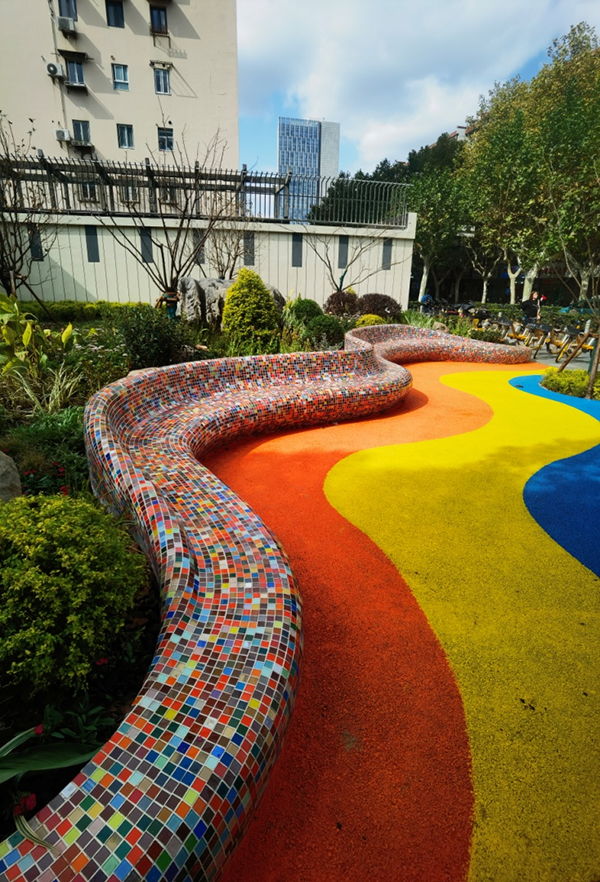 七彩的小瓷磚像游龍、如彩虹,從鞍山支路一彎一折迤邐到彰武路,“楊浦公眾號把它稱作‘彩虹公園’,說:街角出現一條彩虹。就這樣傳開了?!崩盍终f,照片發在網上,贊者不斷,我們當然高興。