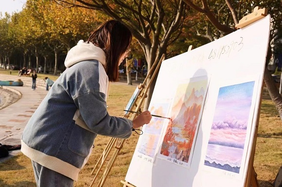 文化市集開市不到半個小時,“校園文創”的攤位前就排起了長隊。攤位上不僅擺放了學校相關的文創產品,自助棉花糖體驗也喚醒了師生的童心。學生創業團隊夢享咖啡攤位上,柿子口味的咖啡已經售罄,小熊造型的咖啡讓人驚呼為藝術品?!斑@是我們新開發的咖啡產品”,攤主笑盈盈地介紹著。思源湖北岸,十幾幅油畫作品正在展出,負責人正在指導體驗者面朝湖邊寫生。寫生的同學看著風景,沒想到自己也成為一道風景。
