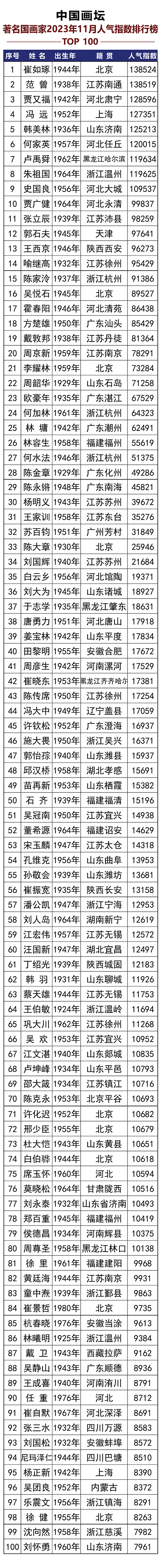 名列11月排行榜前20位的國畫大家是:崔如琢、范曾、賈又福、馮遠、韓美林、何家英、盧禹舜、朱祖國、史國良、賈廣健、張立辰、郭石夫、王西京、喻繼高、陳家泠、吳悅石、霍春陽、方楚雄、戴敦邦、周京新。