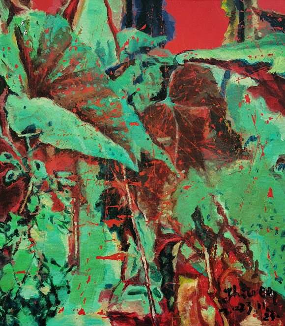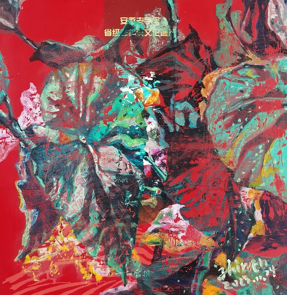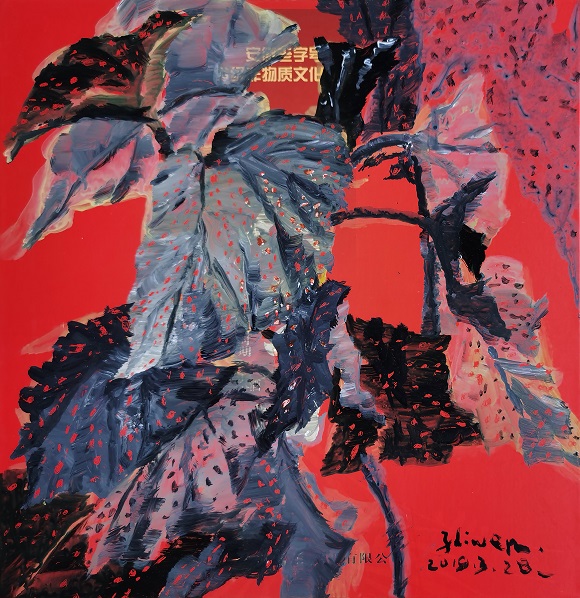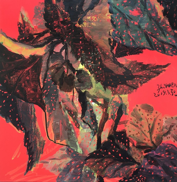 據介紹,這些系列作品自2017年至今斷斷續續地創作了數年。藝術家巧妙地將作品分為三個篇章:清新凌洌的淺灰色、靜謐幽雅的深藍色以及熱烈神秘的大紅色。畫作中的花朵顯得頗具戲劇性,恣意綻放的白百何和即將枯萎的康乃馨以及慵懶舒展的綠葉,在畫面中成為隆重登場的主角。藝術家在有限的二維空間里用書寫入畫的方式神奇地展現了一個豐富與神秘感并存的世界。