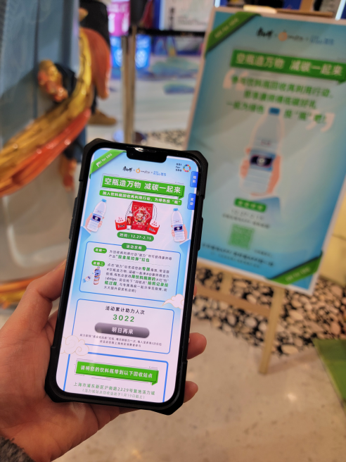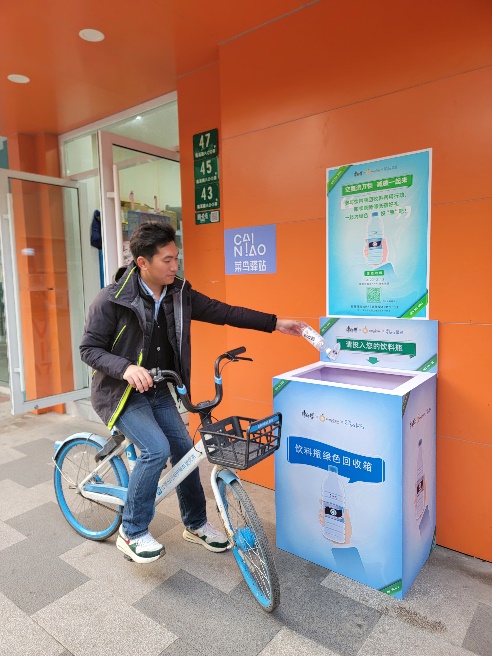 除了環保藝術展覽,共創計劃還推出線上助力活動,并在上海36個菜鳥驛站設立飲料瓶回收站。這些被消費者投入的飲料瓶,將以回收再造環保袋的形式,重新回到前期參與活動的消費者手中,形成閉環,讓他們的低碳行為,獲得回饋。