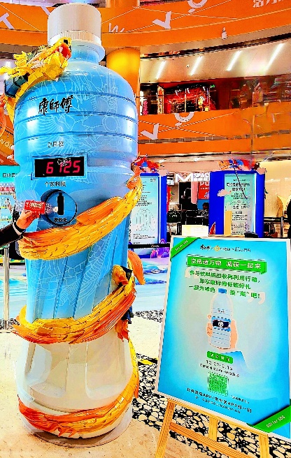 近日,在上海復地活力城中庭,一個巨大的飲料瓶引人注目,它實際上是一個回收裝置,記錄著現場參與“投瓶”的人數。展區內有一條巨型“中華龍”,龍身上的鱗片閃閃發光,它們是由PET飲料瓶回收再造而成。