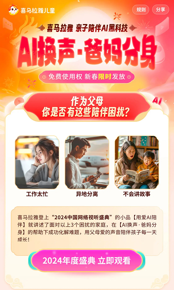 2024年2月3日晚,由國家廣播電視總局指導,中國網絡視聽節目服務協會、中國電視藝術委員會主辦的《同心向未來——2024中國網絡視聽年度盛典》播出。作為承辦單位之一,喜馬拉雅帶來的節目《用AI陪伴》登上盛典舞臺,通過探討AI與愛的關系,喜馬拉雅用AI科技解決了父母們“沒時間給孩子講故事“的問題,展現了科技賦能美好生活的愿景。
