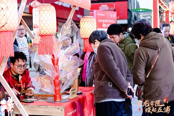 豐富多彩的文化活動,既營造了熱鬧喜慶的氛圍,也豐富了群眾的假期生活,以文化惠民拉動節日消費。本次“新春吉市”推出“時尚消費”和“非遺文創”兩大主題,其中糖畫、捏面人攤位尤其引人注目,作為非物質文化遺產,大人小孩紛紛駐足,看著一個個喜慶的糖畫和面人被工匠的巧手塑造得栩栩如生,許多人現場掏出手機掃碼付款。另一邊,鮮花、玩具和特色龍年文創產品也很惹眼。這些產品兼具龍年特色和江南元素,為市集增添了一份文化氛圍。
