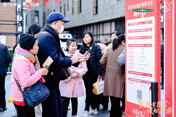 “初四舞龍鬧春……初五醒獅啟市……”中午剛過,就不斷有市民在橋梓灣廣場的節目預告牌前拍照記錄,了解今天安排了哪些活動。從正月初二到初七,市民每天都能體驗到不同的演出。初二初三戲曲展演、初四舞龍鬧新春、初五醒獅財神啟市、初六初七放歌天團絳州龍鼓,豐富的內容既滿足各個年齡族群的喜好,也融入了非遺文化、展現青浦本土特色。