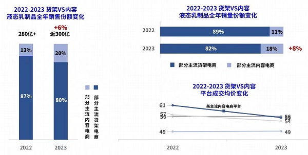 該《報告》指出,為了持續擴大市場規模,品牌方不約而同開始了存量環境的價格博弈。短短一年,某內容電商平臺整體液態乳制品的成交均價,下探到了貨架電商平臺平均水位,并以此為抓手,將銷售/銷量份額,均拉動近7個點的增長。