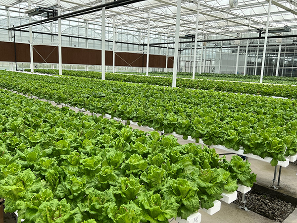這種高密度養殖,大大提高了魚的產量。同時也提高了蔬菜的產量與品質。通常露地生長的蔬菜,一年最多4-5茬的產量。土地生長受自然條件限制,如果不停地去“使喚”它,久而久之,就會產生土壤板結、鹽堿化等問題。因此,露地種植的蔬菜生長到一定程度會不同程度地纖維化,口感變得很柴。而魚菜共生大棚種植的蔬菜,通過水培模式循環種植,可以源源不斷地吸收由魚類糞便發酵產生的有機肥,正因為養料、水分供應充足,水培蔬菜口感也比普通蔬菜更脆,即使長老了,依然水嫩。產量可達6-8茬,甚至10茬。工作人員隨手從種植槽中取出一棵水培蔬菜,可以清晰地看到其根系的生長?!棒~菜共生共用水體,種植的菜無需打農藥,純凈無污染??芍苯邮秤??!?/p>