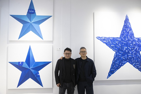 今年的世界自閉癥日,藝術家楊燁炘繼續延續之前的“今天不說話”主題,特別創作了《今天不說話》系列六。這是一組三聯油畫,一幅是將近百個印有“今天不說話”的口罩拼成巨大的藍色五角星,另外二幅是將口罩如同破抹布一樣扔在藍色五角星上,以此來表達對“自閉癥國家”的擔憂和“星星孩子”的深思。