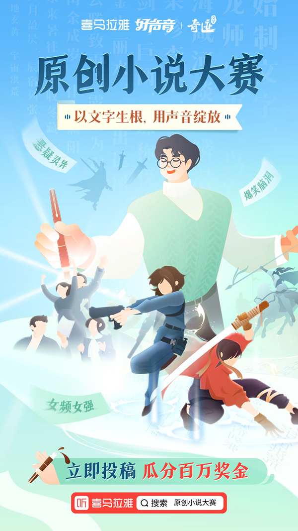 繼去年推出“首屆懸疑原創大賽”后,喜馬拉雅將此賽事升級為近日推出的“原創小說大賽”,征稿內容聚焦“精品IP”和“經典網文”兩大賽道,并邀請懸疑暢銷書作家“紫金陳”、暢銷書作家暨編劇“匪我思存”、喜馬拉雅超人氣主播“有聲的紫襟”、SMG資深制作人、喜馬拉雅原創作家“風塵散人”及“浪高三尺三”等組成大咖評審團,與喜馬拉雅官方編輯部共同參與評獎,SMG也將選擇大賽中優秀的潛力作品探索影視化的可能。