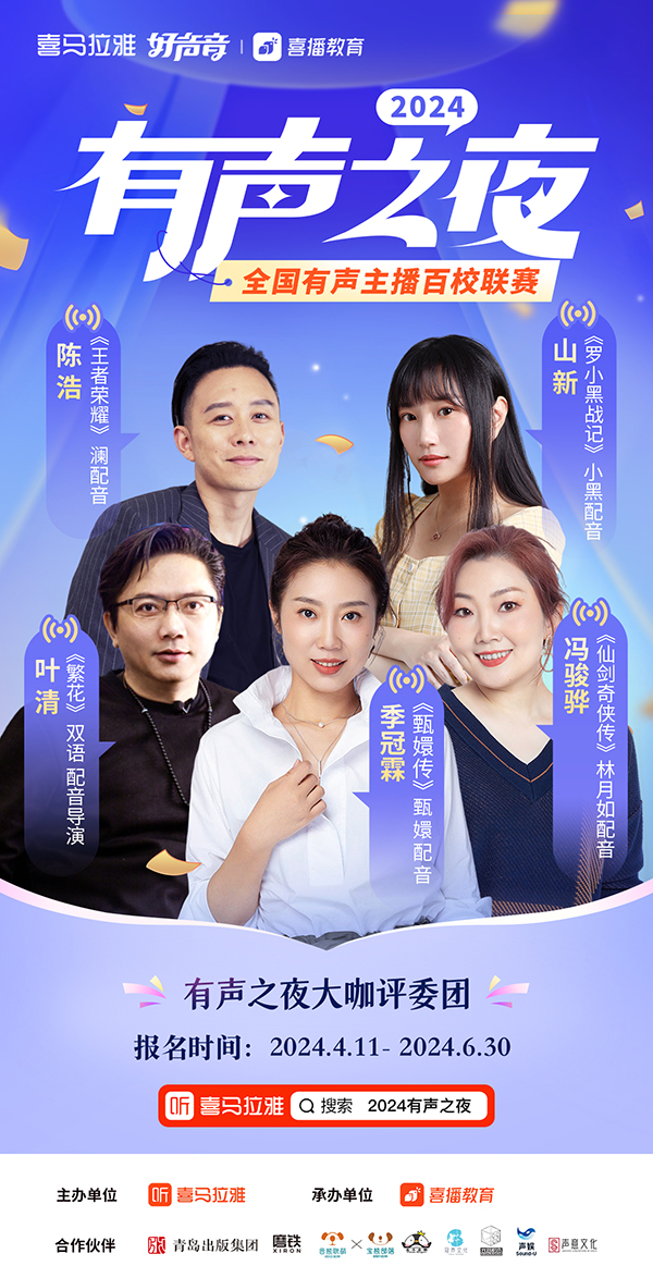 今年的有聲之夜將于6月30日截止參賽報名,7月將啟動海選、初賽及復賽。大賽決賽預計將于11月上旬在浙江省嘉興線下舉行。屆時,《甄嬛傳》甄嬛配音演員季冠霖、《天龍八部》段譽配音演員葉清、《秦時明月》天明配音演員馮駿驊、《哪吒之魔童降世》配音導演陳浩、《羅小黑戰記》小黑配音演員山新將擔任總決賽評委。從比賽中勝出的前10強選手將獲得瓜分萬元獎金、有聲劇錄制推廣、簽約喜馬拉雅等獎勵。