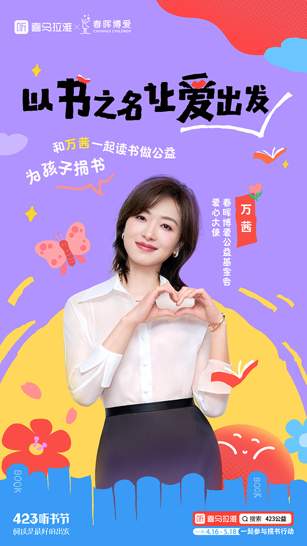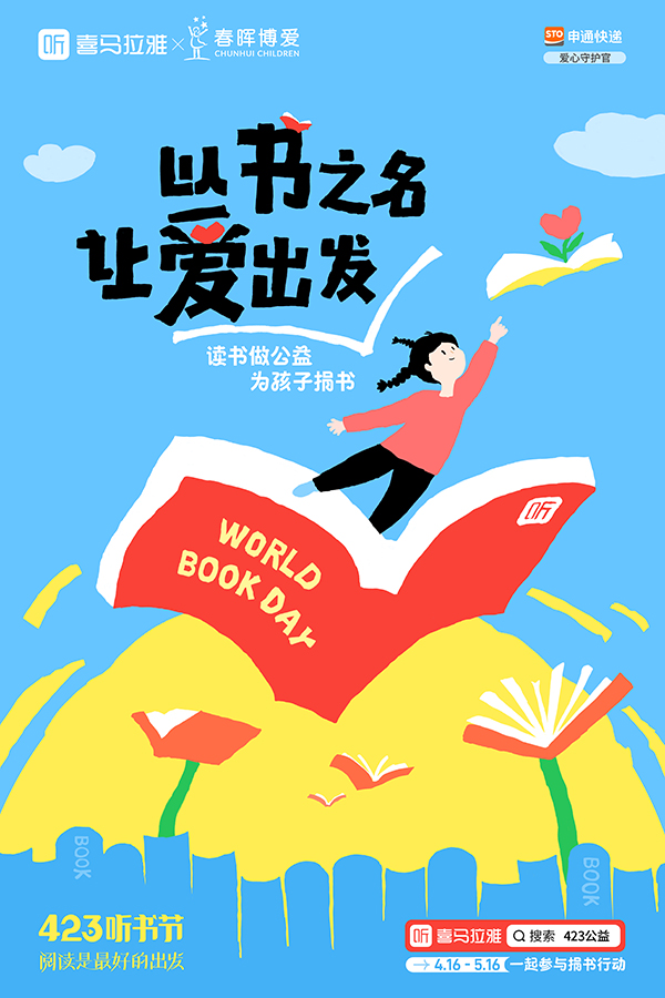 4月23日,是第29個世界讀書日,也是喜馬拉雅第七屆“423聽書節”。本屆“423聽書節”中,喜馬拉雅聯合春暉博愛公益基金會,攜手春暉博愛愛心大使萬茜、張鈞甯、papi醬、李若彤、韓棟、文詠珊,“愛心守護官”申通快遞,以及PAGEONE、鐘書閣、方所、TSUTAYA BOOKSTORE等15座城市的20多家書店發起了“以愛之名,讓愛出發”公益捐書活動,讓孩子們在書中遇見新知、遇見更大的世界。