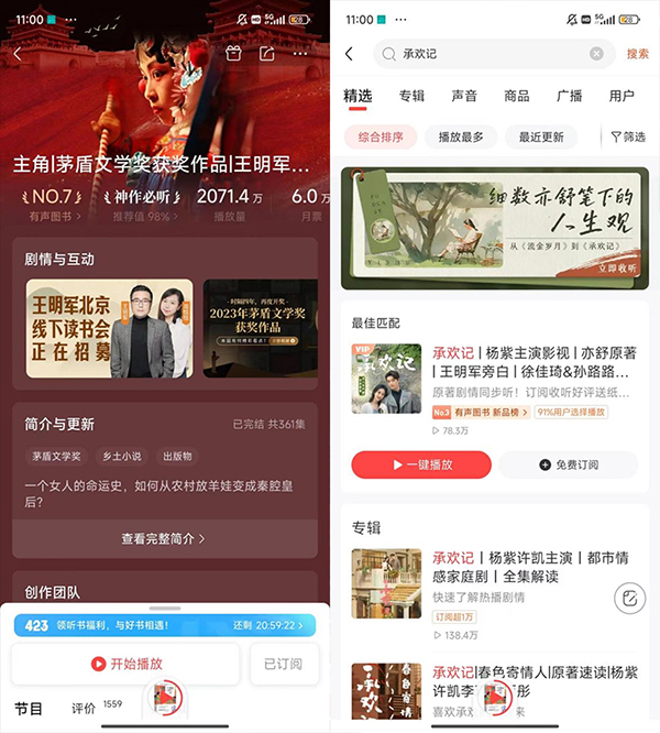 進入423聽書節以來,平臺網文小說類重磅作品的日均關注程度持續提升,用戶有效播放時長上漲11.61%,女頻小說《風華鑒》《瑯琊榜》備受關注,男頻小說《大明:家父永樂,永鎮山河》《我的老千江湖》《陽間借命人》《這個神仙有點彪》《慶余年》《上山為匪》《帝師縣令》《重回1982小漁村》等爆款熱門佳作,播放量增長迅速。在網絡文學用戶追求爽感的趨勢下,內容類型更加多元化。