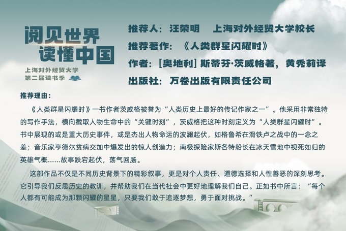 茨威格被譽為“人類歷史上最好的傳記作家之一”。今年上海對外經貿大學校長汪榮明推薦的便是這位文學大師的經典作品《人類群星閃耀時》。在此書中,茨威格采用非常獨特的寫作手法,橫向截取了14個歷史人物生命中的“關鍵時刻”,并把這種時刻定義為“人類群星閃耀時”。校長汪榮明評價道:“這部作品不僅是不同歷史背景下的精彩敘事,更是對個人責任、道德選擇和人性善惡的深刻思考。它引導我們反思歷史的教訓,并幫助我們在當代社會中更好地理解我們自己。正如書中所言,每個人都有可能成為那顆閃耀的星星,只要我們敢于追逐夢想,勇于面對挑戰?!?/p>