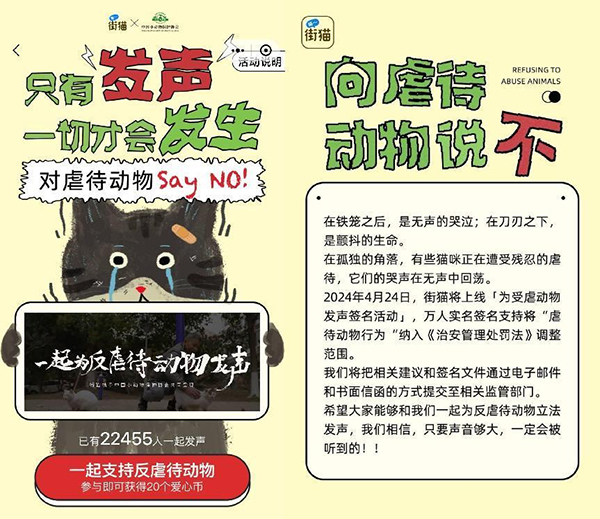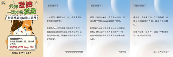 為將“反虐”理念廣泛傳播、覆蓋社會各界人群,4月,街貓站內由多位貓屋守護人代表以訪談形式為保護小動物應援發聲。4月24日當天,街貓同步上線了“為受虐動物發聲簽名活動”,廣泛收集各界共識、支持將“虐待動物行為”納入《治安管理處罰法》調整范圍?;顒酉嚓P負責人提及,該簽名文件及搜集到的建議內容亦將通過電子郵件和書面信函方式提交至相關監管部門,進一步共促反虐待動物相關立法加快完善。