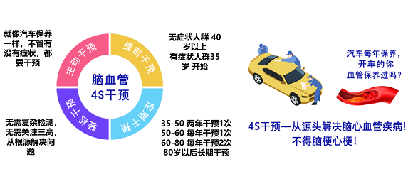 上海東方腦科學研究所、長三角普惠醫療健康發展聯盟腦健康專委會、上海胡錦華健康教育促進中心、中國老齡產業協會醫養結合與健康管理委員會、中國網中國商務頻道、瑞梅集團及上海各大三甲醫院專家學者共同發起的腦健康指導站項目,推進“早期篩查、精準評估、干預防控、健康管理、科學普及”五位一體腦健康管理服務體系,建立“教—檢—療—管”標準化指導流程,從源頭解決腦心血管疾病,基本實現動態清零。并在此基礎上,提出4S干預理念: