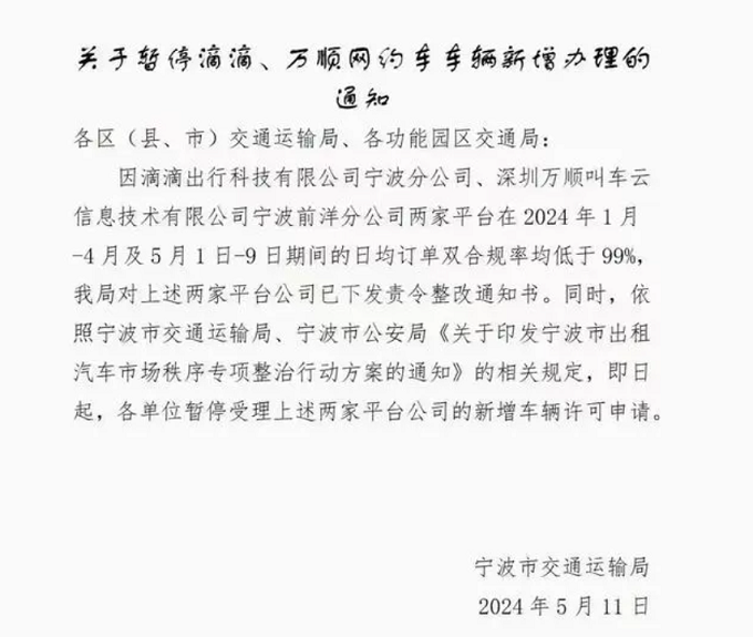 近日,浙江寧波市交通運輸局對滴滴出行科技有限公司寧波分公司、深圳萬順叫車云信息技術有限公司寧波前洋分公司下發責令整改通知書,并要求各單位暫停受理上述兩家平臺公司的新增車輛許可申請。