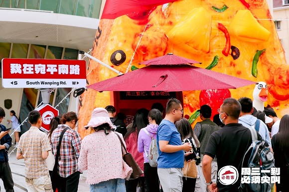近日,上海宛平南路與中山南二路路口空降巨型披薩,吸引大量游客和路人紛紛駐足打卡,在社交媒體上迅速引起關注與熱議。一旁必勝客“尖叫星期三”五周年的打卡點人流絡繹不絕,不少消費者搶先領到了必勝客和宛平南路600號聯動的活動紀念品,直言“非常符合打工人需要減壓的心理”!