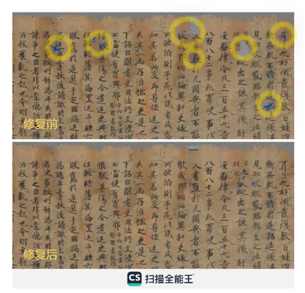 在掃描全能王的智能高清濾鏡算法的加持下,AI古籍修復模型具備優秀的圖像處理能力,模型可智能學習不同古籍文字風格、紙張背景,對損壞區域的字體內容、風格進行高度還原,盡可能確保修復區域的文字風格、背景與原古籍的一致性,做到“修舊如舊”。
