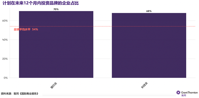銀行業和科技業是尤為注重品牌投資的兩大領域。數據顯示,70%的銀行企業和68%的科技企業計劃在未來12個月內進行品牌投資,這一比例顯著高于54%的全球平均水平。