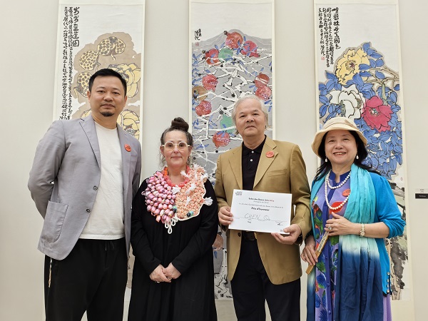 陳琪受邀赴法國參加了沙龍展開幕式及頒獎儀式。展覽期間,陳琪的書法作品“文明互鑒”,由陳琪文化藝術基金會捐贈給法國的國家美術機構收藏?!拔拿骰ヨb”,寓意東西方文明相互交流、相互借鑒、相互輝映。