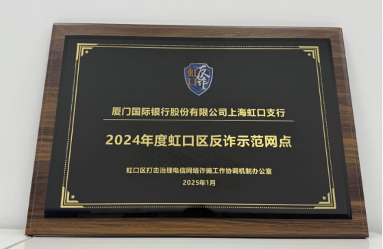 近期,廈門國際銀行上海分行憑借反詐攔阻、科技賦能、特色防宣等方面的出色表現獲得“2024年度虹口區反詐示范網點”、2024年度市區兩級反詐工作優秀個人等榮譽,用實際行動有力保護群眾財產安全。