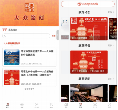 平臺接入了智能交互系統deepseek和AR增強現實鏈接模塊,其中AR功能更將觀展體驗推向高潮——當觀眾掃描展廳內的中軸線微縮模型時,手機屏幕即刻綻放出大眾篆刻作品與北京中軸線相互交融的立體煙花秀,傳統技藝與現代科技在此刻迸發璀璨光華。
