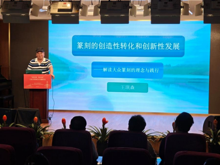 上海中國書法院副院長、西泠印社社員王琪森王琪森介紹了大眾篆刻的推廣和實踐,比如,從玻璃微珠、光敏樹脂、玻璃纖維等新材料的引進,再到數字化、智能化、3D化的高科技制作等。