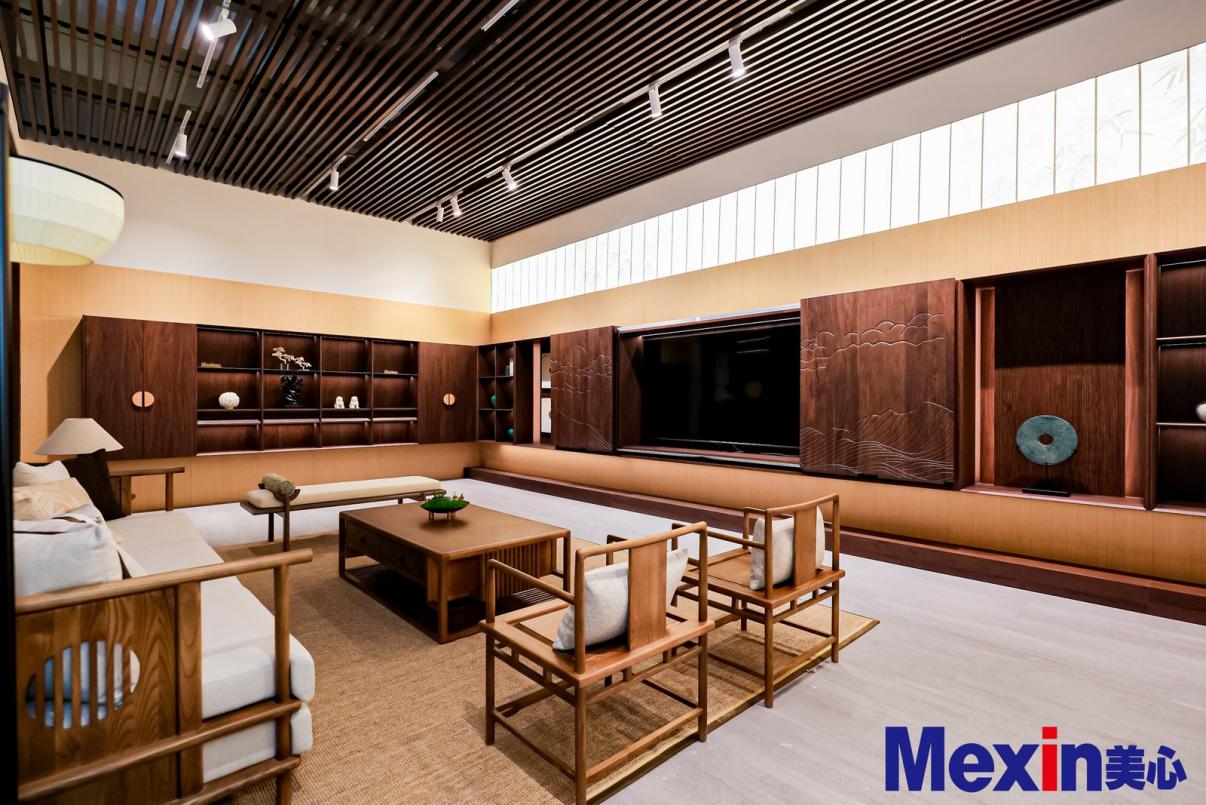 本次美心門的展陳設計,正是其品牌理念“山水本心宋韻新生”的具象化表達。步入展區,觀眾瞬間被帶入一幅流動的宋韻山水畫卷。黛色與素白的主色調營造出靜謐悠遠的意境,展臺布局如山巒起伏,流暢的線條則勾勒出東方美學特有的含蓄與力量感。
