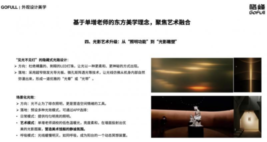 色彩體系的革新同樣令人矚目。格峰將從宋代陶瓷巔峰時期的窯變美學中提取靈感,打造“云翳灰、月光帛、墨石、玄墨”四大基礎色,低調包容適配各類家裝風格;更推出“釉里紅、天青、秋檀、緗葉”四款藝術色,每一款均對應一段文化故事,如“天青色”源自宋瓷“雨過天青云破處”的經典意境,僅用于單增聯名限量款,附帶唯一編號的藝術收藏證書。而光影設計則是此次升級的“點睛之筆”:通過超窄側發光導光板與微孔矩陣透光技術,實現“見光不見燈”的效果,預設“日常模式”“藝術模式”“呼吸模式”三種光效——其中“藝術模式”經單增教授親自調校,低色溫暖光會在墻面投射出竹影、窗欞等東方意象,讓陽臺瞬間變身“微型藝術畫廊”。