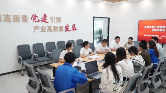 在東海水晶產業鏈黨群綜合服務中心,調研團隊與相關工作人員面對面交流,深入了解如何將黨的組織優勢有效轉化為產業發展優勢。該中心以“七彩晶鏈”工作機制為抓手,整合物業服務、電商培訓、知識產權保護等多項職能,為產業鏈上下游企業提供“一站式”服務平臺。
